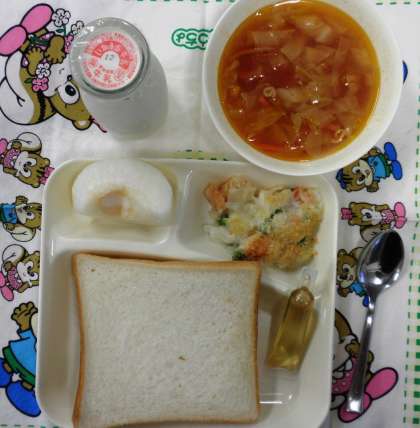 えびグラタン、トマトスープ、なし(豊水)、食パン、はちみつ、