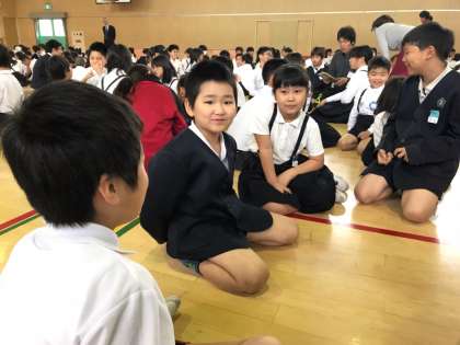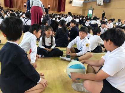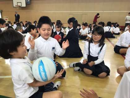 ばくだんゲームは班で円になって座り、ボールを隣の人に渡していきます。