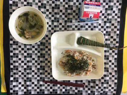 こどもの日の行事献立です。こどもたちの成長を願って「ちまき」をつけています。