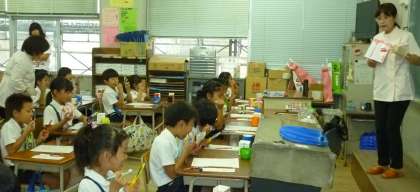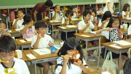 学校歯科医の栃谷先生と歯科衛生士の東久保先生・島本先生が、指導してくださいました。歯のよごれをお薬で染め出してみて、みがき残しのないみがき方、自分の歯に合ったみがき方を勉強しました。
