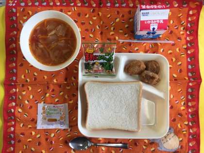 一口トンカツ、ミネストローネ、豆こんぶ、食パン、アプリコットジャム、牛乳