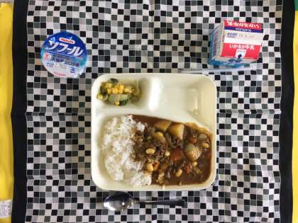 牛肉と大豆が入ったカレーライスです。児童に大人気のメニューです。