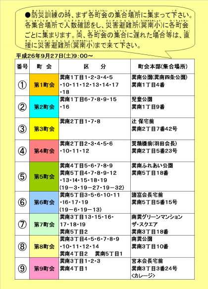 巽南地域と連携した防災訓練が9月27日(土)に実施されます。この取り組みは、昼夜問わず突然に発生する災害に備え、地域・学校が一体となり、住民や特に子どもたちの「いのち」を連携・協力し守っていく防災訓練です。つきましては、保護者の皆様も全員参加していただき、地域の方々と連携し、子どもたちが安全に避難できるようご協力よろしくお願いいたします。尚、詳しくは、本日配布のプリントをご覧ください。また、右配布文書の学校長だより「土曜授業・地域防災訓練」をご覧ください。