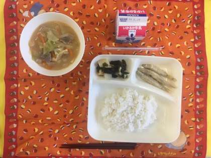 きびなごてんぷら、豚汁、わかたけ煮、ご飯、牛乳