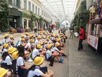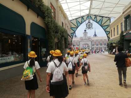 スペイン村に到着しました。チケット・パンフレット等を受け取って先生の指示・説明を聞きます。そして集合写真を撮って、班行動開始です。