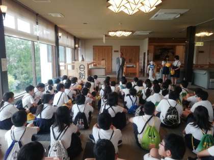スペイン村を出発して、宿舎に到着しました。そして、開舎式と避難訓練を行いました。なんと、ロボットのペッパー君が出迎えてくれました。