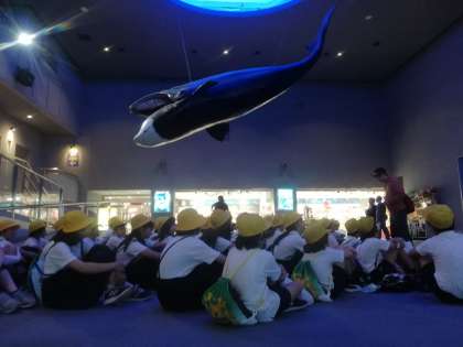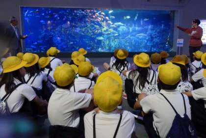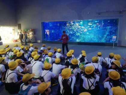 鳥羽水族館での活動について先生から指示・説明がありました。エントランスホールには巨大な水槽があり、とてもきれいです。