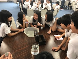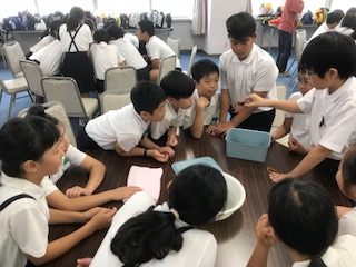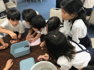 まずは、生きもん発見教室を体験します。様々な生き物を触りながら、クイズに答えながら学習します。