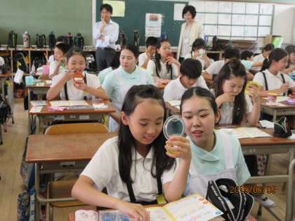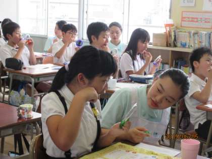 教えてもらい、歯と歯のあいだの汚れをとる練習