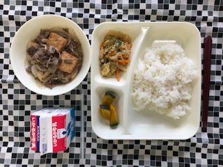すき焼き煮、焼きかぼちゃ、野菜のそぼろいため、ご飯、牛乳