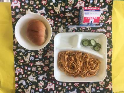 スパゲッティミートソース、きゅうりのバジル風味サラダ、黒糖パン1/2、牛乳