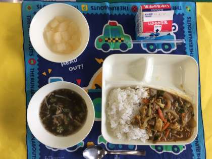 和風カレー丼、もずくとオクラのとろり汁、和なし(缶)、ご飯、牛乳