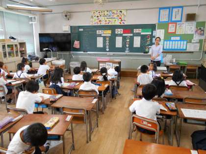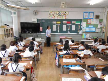 栄養教諭の松廣先生の食育の授業がありました。1年生にとっては初めての食育の授業でした。「たべもののなまえやはたらきをしろう」をめあてに、赤、青、黄の食べ物のグループがあることを学習しました。