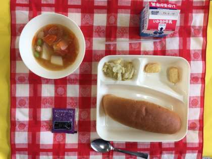 いかてんぷら、フレッシュトマトのスープ煮、サワーソテー、黒糖パン、牛乳