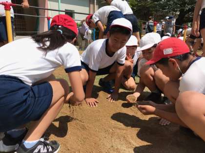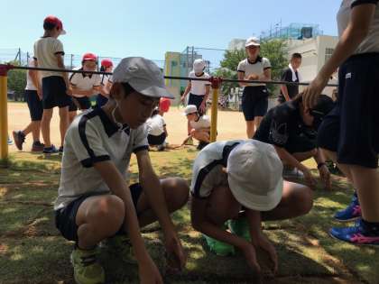 土を触っていると楽しいようで、みんな笑顔で芝生に土をまいていました。