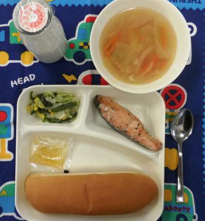 さけの香草焼き、スープ、野菜ソテー、コッペパン、マーマレードジャム、牛乳