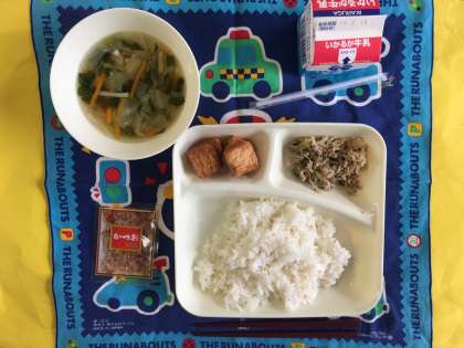 ゴーヤチャンプルー、すまし汁、あつあげのしょうがじょうゆかけ、ご飯、牛乳