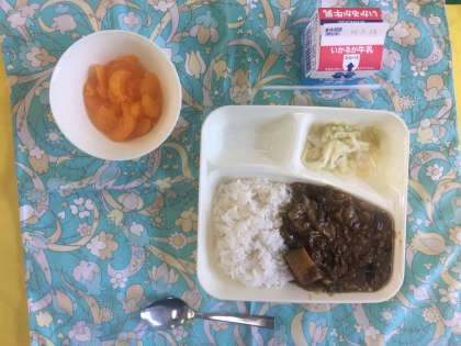 夏野菜のカレーライス、キャベツのサラダ、みかん(冷)、牛乳