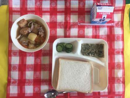 もずく入りヒラヤーチー、豚肉といかの煮もの、きゅうりの甘酢づけ、米飯、牛乳