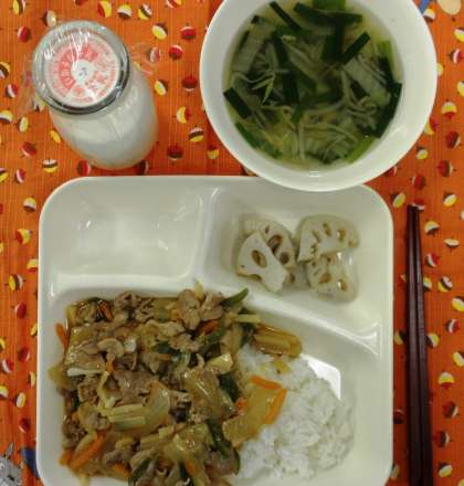 ピリ辛丼、ワンタンの皮スープ、れんこんのオイスターソース焼き、牛乳