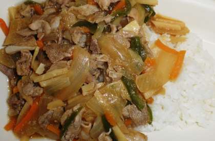 豚肉、たまねぎ、たけのこ、にんじんなどをみそと、しょうゆで味つけした丼です。トウバンジャンでピリ辛にしています。