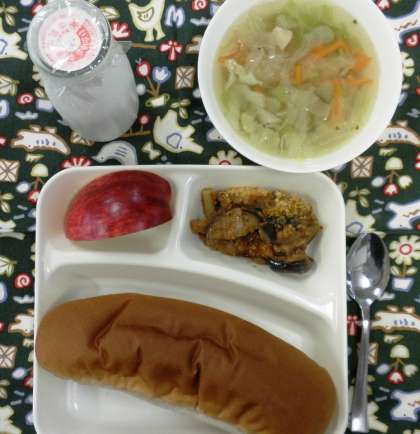 なすのミートグラタン、野菜のスープ、りんご、パン、牛乳
