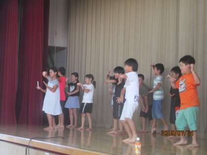 1年生、2年生、3〜5年生に分かれてミニ発表会をしてダンスの見せ合いをしました。みんな、独自の踊りも上手に交えて、そろった動きを見せていました。