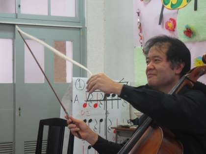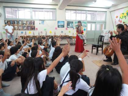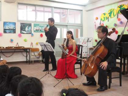 日本の主要オーケストラとの共演、海外での演奏、多くのテレビ出演等で活躍中の「ふれあいトリオ〜吉田恭子と仲間たち」をお招きして、5年の子どもたちに、音楽を通しての感動を味わわせていただきました。【ヴァイオリン:吉田恭子さん、チェロ:渡部玄一さん、ピアノ:白石光隆さん】