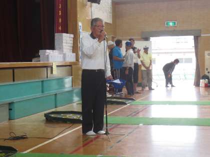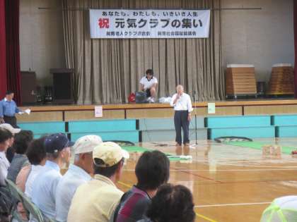 巽南地域の「元気クラブの集い」が小学校の講堂で行われました。はじめに巽南老人クラブ会長の藤原武司さん、巽南まちづくり協議会理事長の松下光夫さんの挨拶がありました。青少年福祉委員・青少年指導員・スポーツ推進委員の方々が協力され、スムーズに進行されておりました。