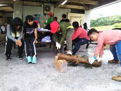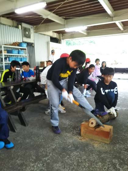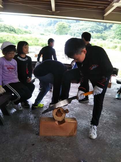 切った木を軽トラックに載せて、宿舎まで運んでもらって、今度はさらに輪切りにしていきます。