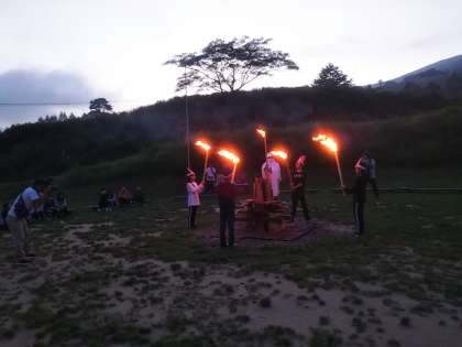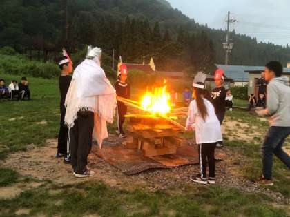 火の神がお供に火を分けて、その火を薪に点火してキャンプファイヤーの始まりです。