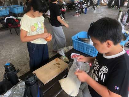 スタッフの方の説明を受けて、野菜を切る係、火を起こす係、お米を研ぐ係など班で役割を決めて、協力してカレーライスを作っていきます。
