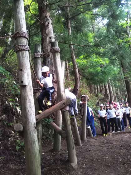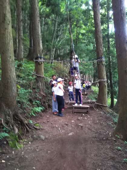 自然の中で、木とロープなどでつくられたアスレチックにチャレンジしました。あわてず少しずつ、確実に進むことができました。