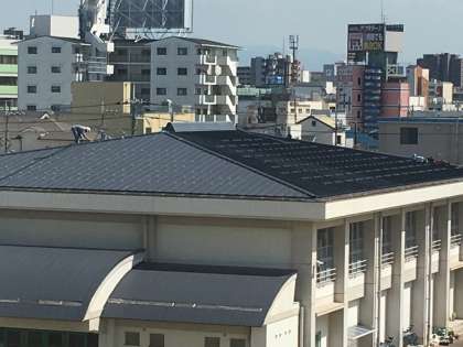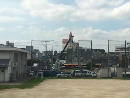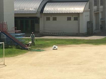 本日より体育館の屋根への太陽光パネル設置の工事が始まりました。非常時には電源として使用できます。また、管理作業員さんは運動場の芝刈りを1日していました。皆さん暑い中での作業ご苦労様です。夏休みの間は、このように様々な工事や作業が行われています。