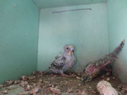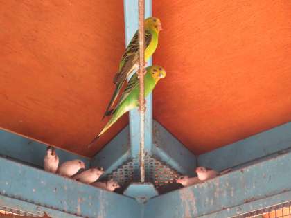 巣箱にはセキセイインコのヒナが2羽います。親鳥がしっかりと食べ物をあたえ、大きく育っています。巣立つ日が楽しみです。