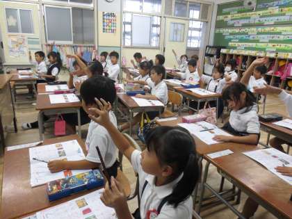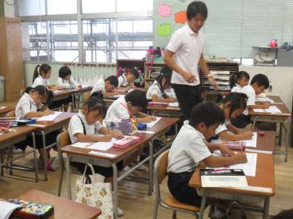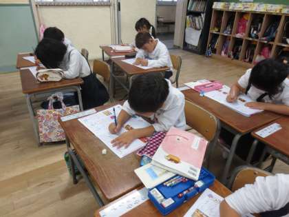 みんなで書き順の練習をしてから、書き方ノートにていねいに書いていました。