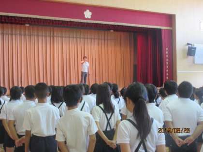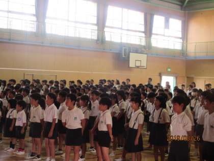 夏休みの生活の反省と2学期の生活について、生活指導の前田先生よりお話がありました。そして、新田先生の指揮で校歌を歌いました。みんな元気よく歌っていました。
