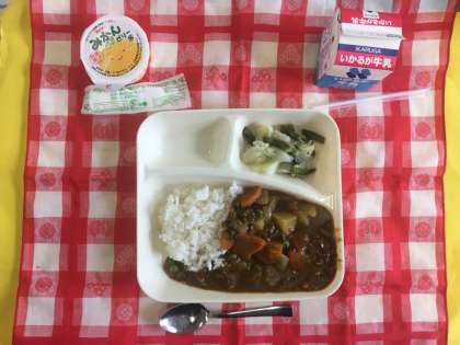 ビーフカレーライス、野菜のピクルス、みかんゼリー、ご飯、牛乳