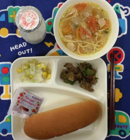 牛肉のカレー風味焼き、トマトのスープスパゲッティ、キャベツとコーンのピクルス、コッペパン、いちごジャム、牛乳