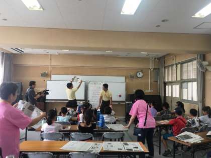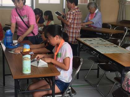 お米とカレーが炊き上がる間、防災学習の一つである、新聞紙でのカレー皿作りとスリッパ作りをしました。