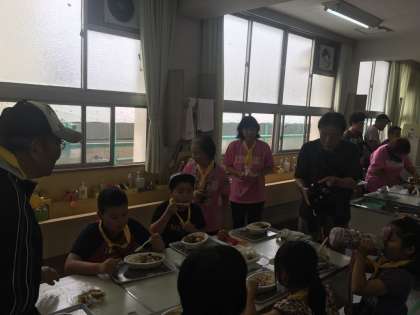 グループごとにカレーとごはんを入れて、食べています。とてもおいしくできあがりました。
