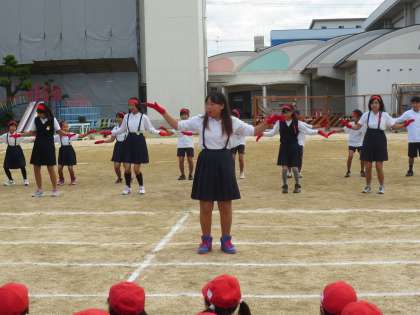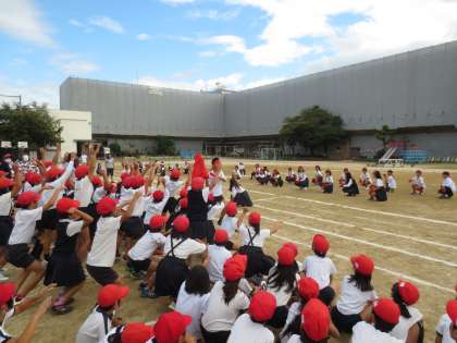 赤組が応援の練習をしています。応援団が大きな声でみんなをリードしていました。