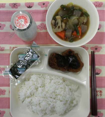 みそカツ、鶏肉とこんにゃくの煮もの、焼きのり、ご飯、牛乳