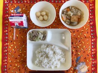 鶏肉とさといもの煮もの、豚肉とキャベツのいためもの、みたらしだんご、ご飯、牛乳
