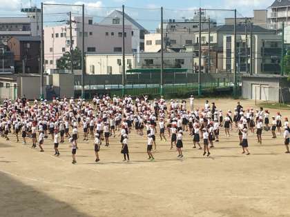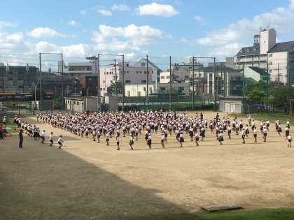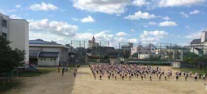 今日の朝の時間は、全校児童で、運動場でラジオ体操と整理体操の練習をしました。その後は運動場の石拾いをしました。来週の集会の時間は、校歌と運動会の歌の練習をします。