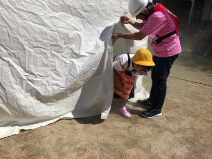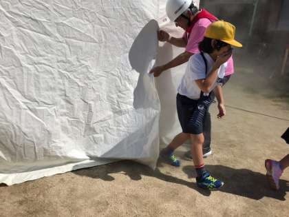 煙中体験の様子です。水蒸気で煙を発生させています。
