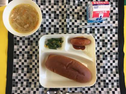 フランクフルトのケチャップソース、スープ、さんどまめとコーンのサラダ、黒糖パン、牛乳