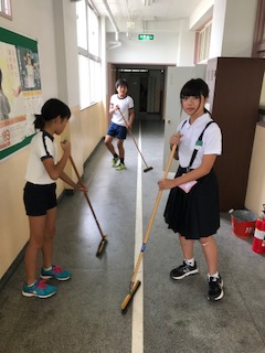 1年生の教室前廊下でも、お互い協力し合って掃除