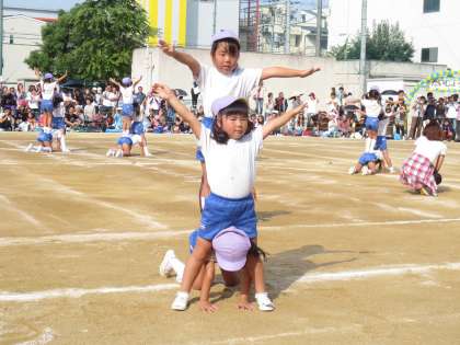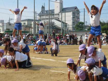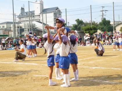 巽南小学校の運動場で、日の出学園の運動会が行われました。しっかりと演技をしていて感心しました。年長の子どもたちの見事な組体操を載せております。