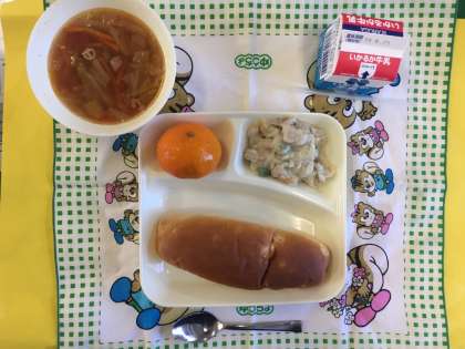 豆乳マカロニグラタン、トマトスープ、みかん(冷)、おさつパン、牛乳